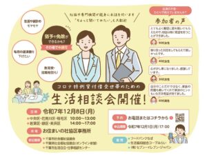 新型コロナウイルス感染症の影響を受け、一時的な減収等により千葉市社会福祉協議会で「緊急小口資金」や「総合支援資金」等の特例貸付をご利用された方を対象に、生活相談会を開催いたします。